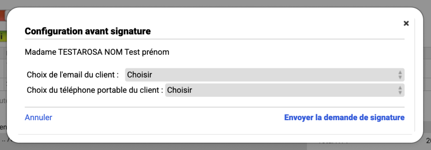 Une fenêtre vous invite à sélectionner l’email et le numéro de téléphone du client.