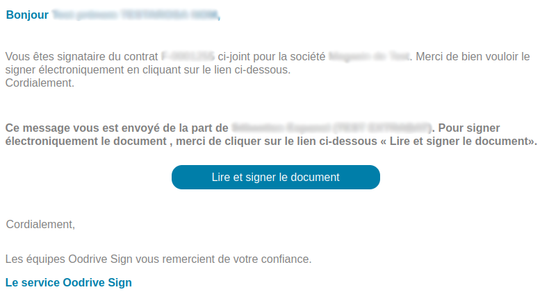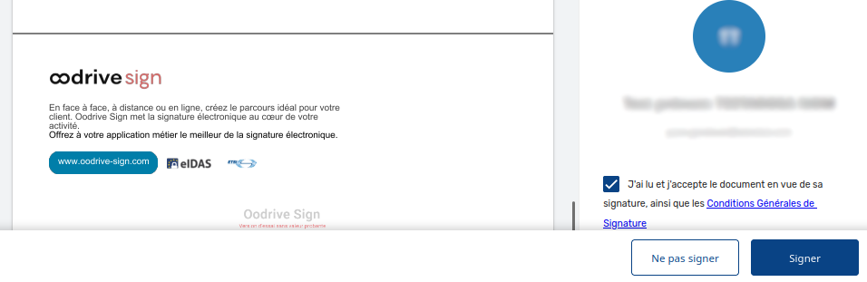 Le document sera transmis à votre client via Oodrive Sign, qui se charge de l’authentification et du processus de signature électronique du document.