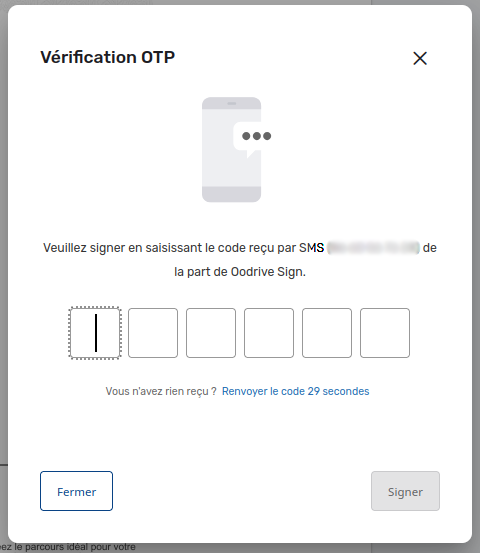 En cliquant sur « Signer« , un code de vérification est envoyé à votre client par SMS afin de confirmer l’authentification et valider la signature.