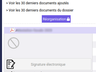 Pour toute demande de signature, l’historique est accessible directement depuis le bouton « Signature électronique » sur la pièce concernée, avec un lien vers le PDF associé.