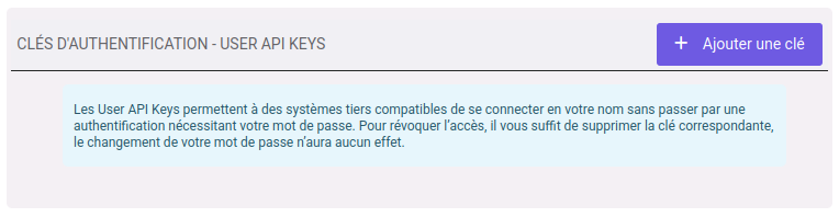 Il est possible, pour les utilisateurs disposant des droits nécessaires, d’accéder aux clés directement dans : Paramètres Utilisateurs → « Clés d’authentification – User API Keys ». Vous pouvez ajouter et gérer vos clés, ce qui peut être utile pour organiser les API Keys ou intervenir dans le cadre de besoins spécifiques.