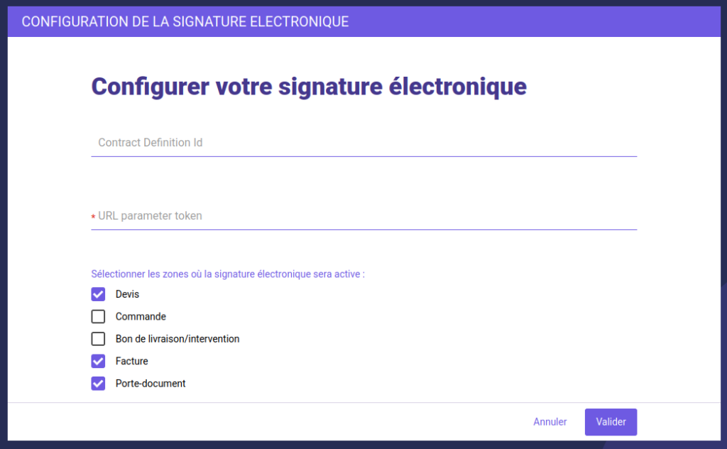 Une fois l’option activée, vous pouvez modifier à tout moment vos préférences concernant les types de pièces commerciales pour lesquelles la signature électronique est activée :