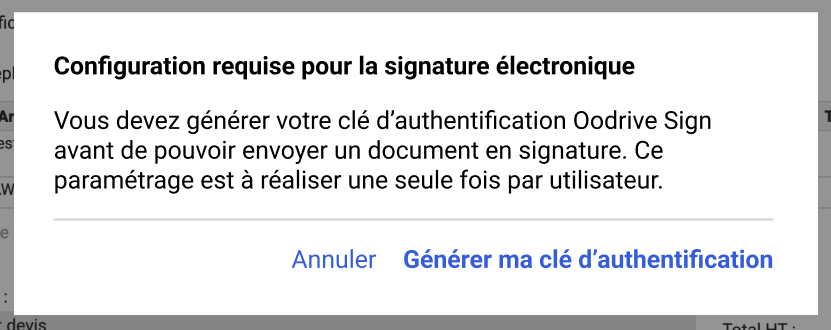 Lorsqu’un utilisateur envoie un document en signature pour la première fois, une clé d’authentification Oodrive Sign doit être générée et associée automatiquement à son compte. Cette clé permet d’assurer la connexion au service de signature et est indispensable pour pouvoir envoyer des documents pour signature.